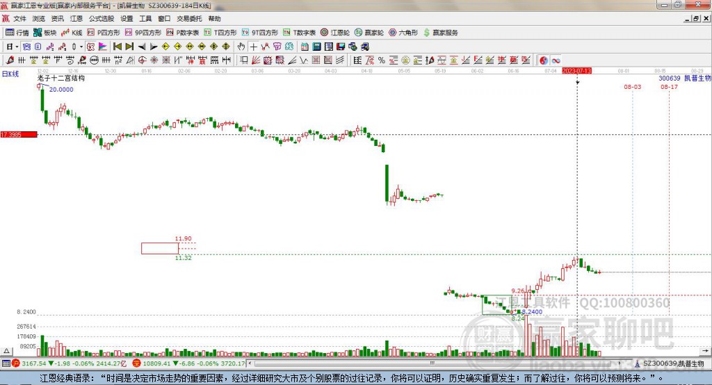 综上:凯普生物(300639)自高点11.19元,经过8天,回落幅度达到9.17%,近期江恩时间窗为8月3日,距今还有10日。