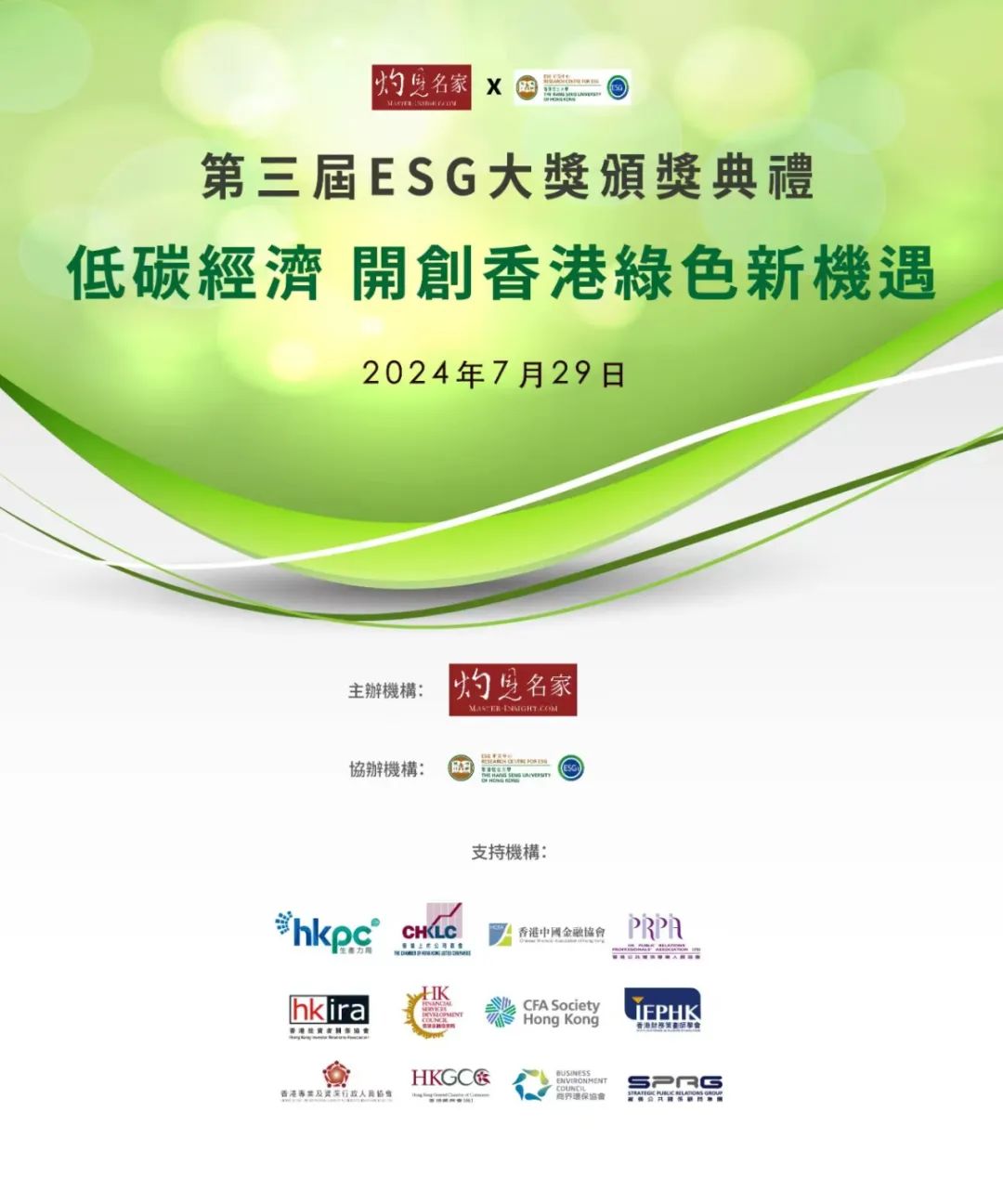 7月29日下午,由灼见名家主办、香港恒生大学ESG研究中心协办的第三届ESG大奖颁奖典礼在香港交易所金融大会堂隆重举行。此次活动中,个人类奖项仅有5个名额,包括1名ESG翘楚大奖和4名ESG卓越领导奖。香港科技大学环境及可持续发展学部首席发展顾问陆恭蕙女士荣获本年度的ESG翘楚大奖,东华三院行政总监苏祐安先生、华懋集团执行董事兼行政总裁蔡宏兴先生、凯普生物总裁王建瑜女士、香港医院管理局主席范鸿龄先生荣获ESG卓越领导奖。