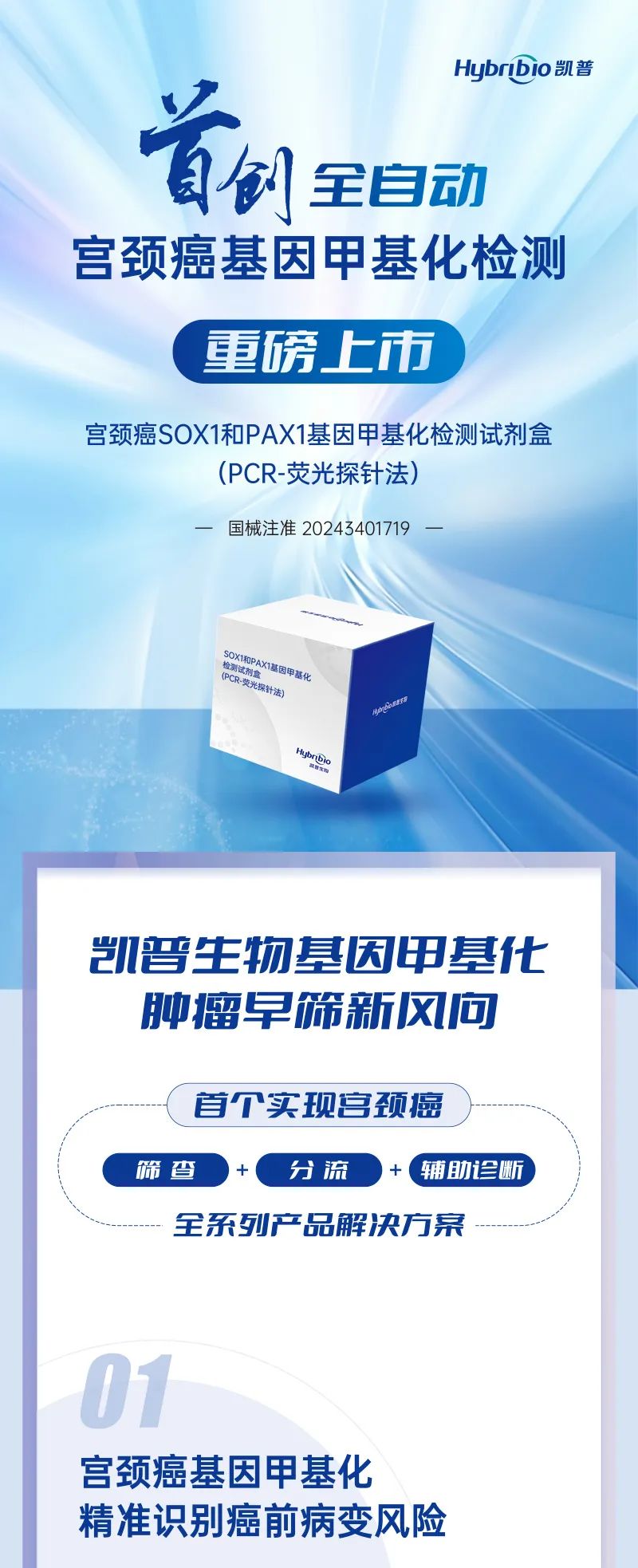 近日,凯普生物联合艾米森研发的宫颈癌SOX1和PAX1基因甲基化检测试剂盒(PCR-荧光探针法),正式获得国家药品监督管理局(NMPA)颁发医疗器械注册证(注册证号:国械注准20243401719)。