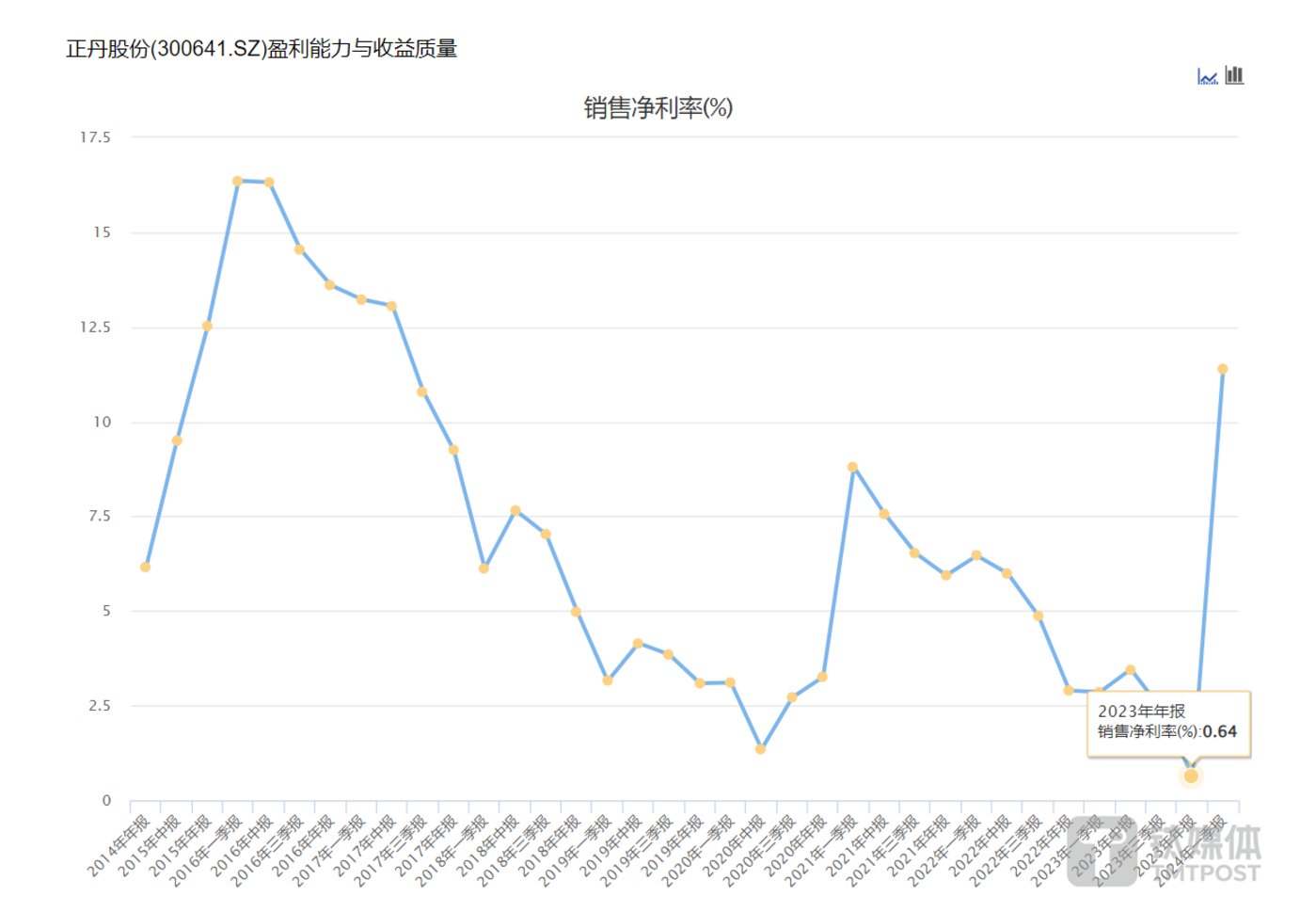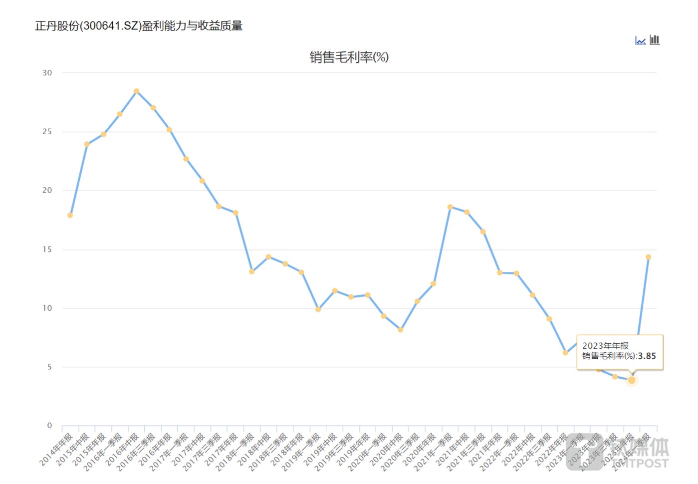 以往偏苯三酸酐由于用量有限,产品的毛利率并不高。2023年年报显示,正丹股份的毛利率和净利率都滑落至历史低点,其综合毛利率只有3.85%,净利率还不到1%。