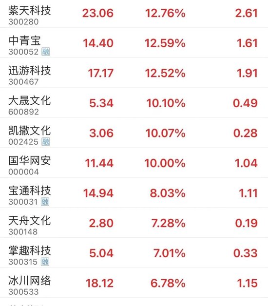 今日早盘,AI多模态题材表现活跃,网络游戏方向领涨。截至午间收盘,汤姆猫以20%幅度涨停,紫天科技(维权)、中青宝(维权)、迅游科技涨超10%,国华网安、凯撒文化、大晟文化涨停。