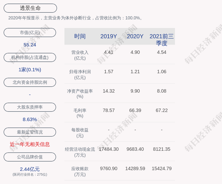 2020年年报显示,透景生命的主营业务为体外诊断行业,占营收比例为:100.0%。