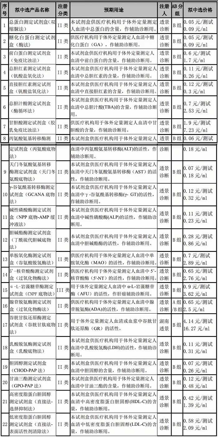 透景生命1月4日公告,公司全资子公司上海透景诊断科技有限公司(以下简称“透景诊断”)和湖南透景生命科技有限公司(以下简称“湖南透景”)参加了江西省肝功生化类检测试剂省际联盟集中带量采购投标工作。根据江西省医疗保障局于2022年12月30日通知,透景诊断和湖南透景共计22个产品拟中选本次集中带量采购。拟中选产品包括总蛋白测定试剂盒(双缩脲法)、糖化白蛋白测定试剂盒(酶法)等。