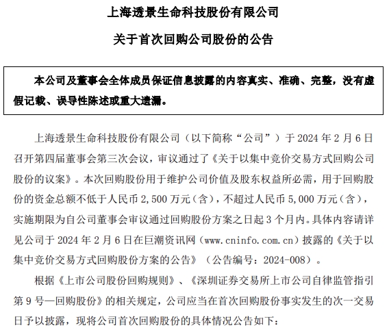 天天康养2月20日讯,上海透景生命科技股份有限公司(以下简称“公司”)于2024年2月6日召开第四届董事会第三次会议,审议通过了《关于以集中竞价交易方式回购公司股份的议案》。本次回购股份用于维护公司价值及股东权益所必需,用于回购股份的资金总额不低于人民币2,500万元(含),不超过人民币5,000万元(含),实施期限为自公司董事会审议通过回购股份方案之日起3个月内。