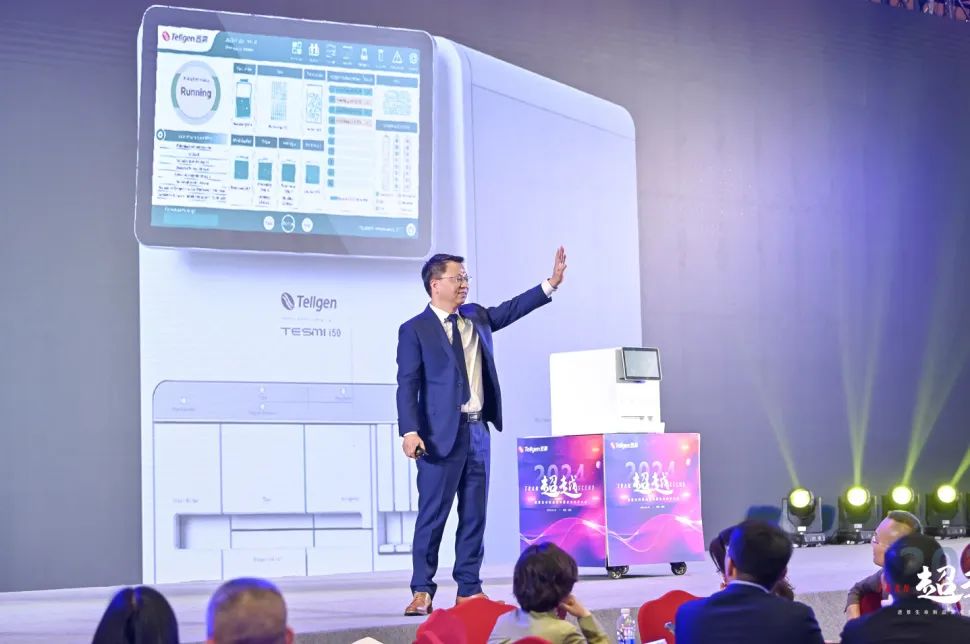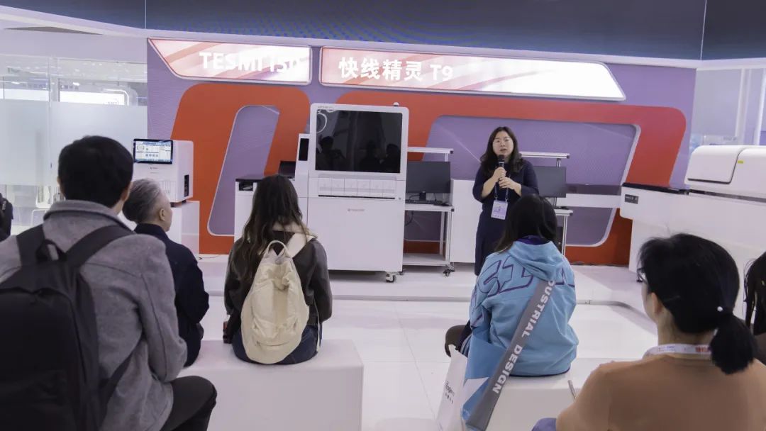 展台现场,透景生命新品揭幕震撼开启,多位专家和行业大咖与透景生命董事长姚见儿先生的见证下共同揭幕,透景生命第三代检验流水线-快线精灵T9正式上线。