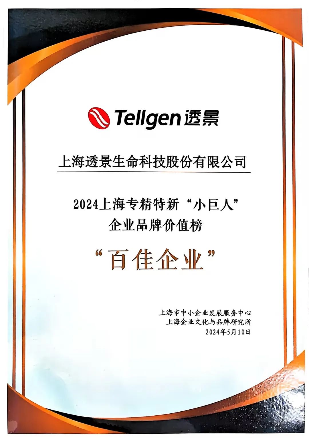 透景生命荣获上海专精特新“小巨人”企业品牌价值榜“百佳企业”