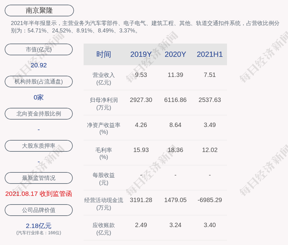 2021年半年报显示,南京聚隆的主营业务为汽车零部件、电子电气、建筑工程、其他、轨道交通扣件系统,占营收比例分别为:54.71%、24.52%、8.91%、8.49%、3.37%。