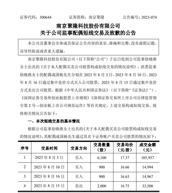 南京聚隆16日盘后公告,近日收到监事徐晓燕出具的情况说明,获悉其配偶成国栋分别在8月3日、8月10日、8月16日通过集中竞价方式买入公司股票,8月15日通过集中竞价方式卖出公司股票,构成短线交易。