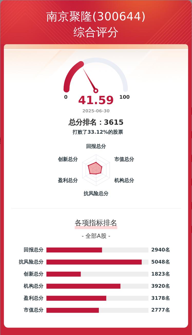 金融界上市公司研究院构建了一套上市公司韧性评价体系,从企业盈利、科技创新、股东回报、经营抗风险、市值表现及机构吸引力六个维度对企业进行量化评分,满分为100分。南京聚隆的韧性评价总分为41.59分,在A股5405家可比上市公司中排名第3615位。