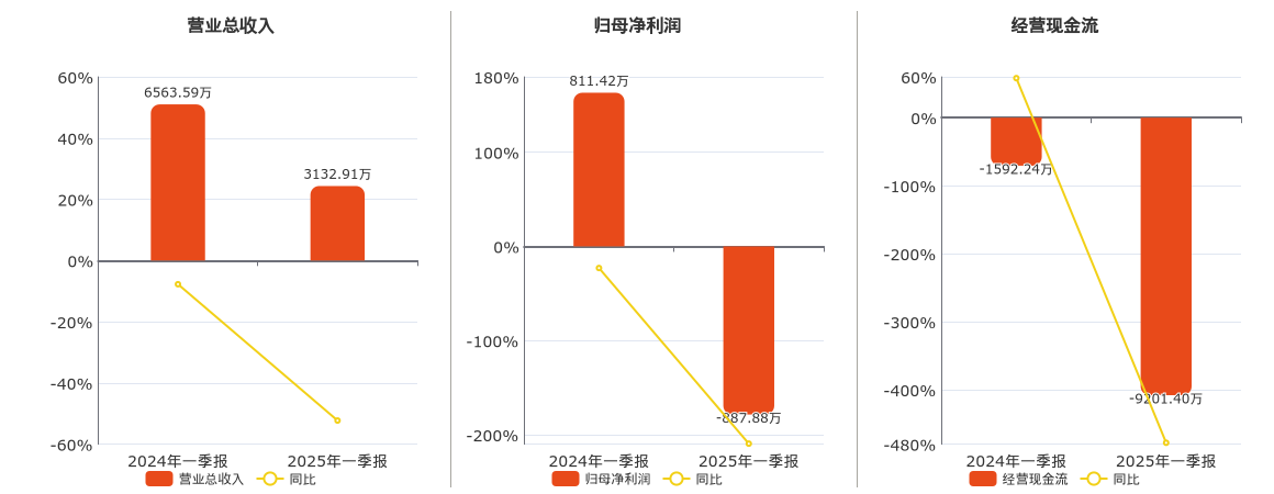 公司营业总收入为3132.91万元,较去年同报告期营业总收入减少3430.68万元,同比较去年同期下降52.27%。归母净利润为-887.88万元,较去年同报告期归母净利润减少1699.30万元,同比较去年同期下降209.42%。经营活动现金净流入为-9201.40万元,较去年同报告期经营活动现金净流入减少7609.16万元。