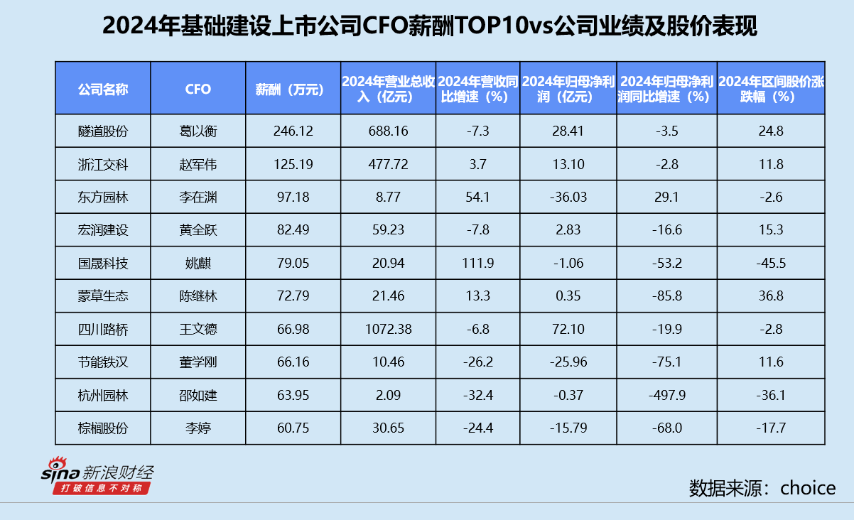 隧道股份葛以衡以246.12万元稳坐第一,约为第二名浙江交科赵军伟年薪的接近两倍。财报显示,葛以衡同时也是公司的党委书记、董事长,自2019年10月开始兼任财务总监一职。薪酬最低的是金埔园林金宇西,当期从公司获得税前报酬总额仅为25.98万元,同比微降8.7%。此外,他还持有公司2024年股权激励限售股15万股。