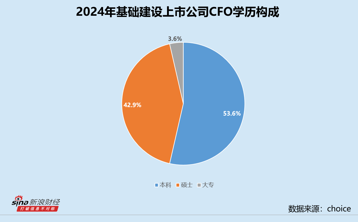 就学历构成而言,若剔除未披露具体信息的*ST元成,在余下的28位基础建设上市公司CFO中,约53.6%为本科学历,硕士约占比42.9%。东珠生态财务总监黄莹最高学历为大专。