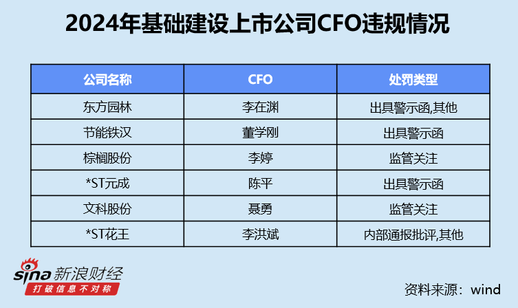 据不完全统计,2024年基础建设上市公司有6位CFO出现违规情况。东方园林李在渊2024年收入高达97.18万元,2024年8月由于中标项目收入金额不准确、业绩预告未准确预计净资产为负、未提前提示公司可能存在退市风险等问题而收到警示函,并记入证券期货市场诚信档案。节能铁汉董学刚和文科股份聂勇,因财务会计核算不规范、减值损失处理不当等问题分别被出具警示函和监管函。棕榈股份李婷、*ST元成陈平及*ST花王李洪斌则因为业绩预告和财报出现多处信息披露错误,被出具监管函并予以通报批评。