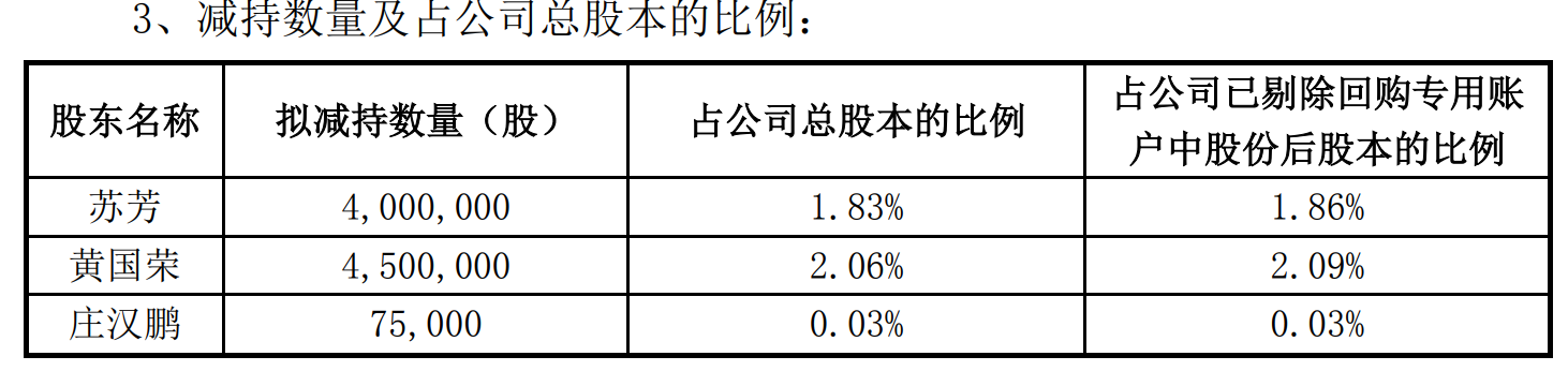 持有公司18,600,720股(占公司已剔除回购专用账户中股份后的总股本的8.65%)的公司董事、副总经理黄国荣计划以集中竞价交易方式和大宗交易方式减持公司股份不超过4,500,000股(占公司已剔除回购专用账户中股份后的总股本的2.09%)。其中,采取集中竞价交易方式减持公司股份的,将于公司减持计划公告披露之日起十五个交易日后的六个月内进行,采取大宗交易方式减持公司股份的,将于公司减持计划公告披露之日起三个交易日后的六个月内进行。