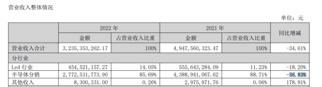 分行业来看,公司Led 行业、半导体分销方面营收分别为4.55亿元、27.73亿元,较去年同期下降18.2%、36.83%。上述两项业务占公司营收比重分别为14.05%、85.69%。