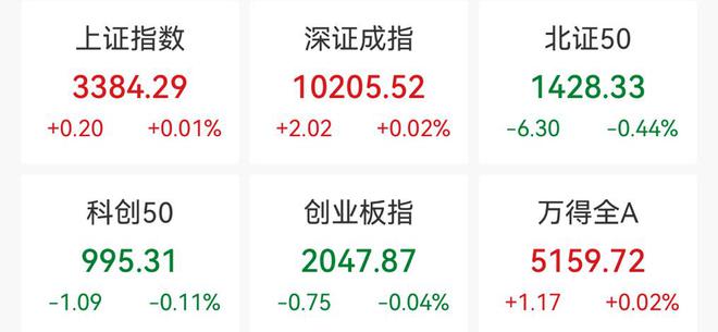 6日早间,A股近乎平开。上证指数涨0.01%,报3384.29点;深证成指涨0.02%,报10205.52点;创业板指跌0.04%,报2047.87点。