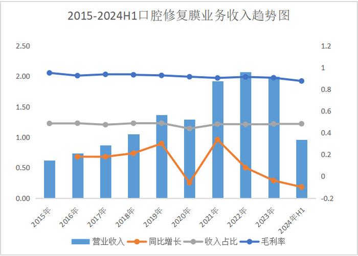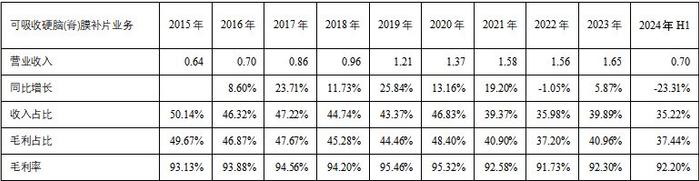 口腔修复膜:主要用于颌面外科和种植牙领域,用于口腔内软组织浅层缺损的修复,加速创口愈合及诱导自体骨再生。公司该产品的主要竞争对手是瑞士盖氏,公司产品是业内较为公认的高性价比产品,产品效果不亚于盖氏,但价格却低于盖氏20%左右,国产替代空间广阔。从2015年到2023年,口腔修复膜营业收入从0.62亿元增长2.2倍至1.99亿元,CAGR为16%,2020年和2023年略有下降。口腔修复膜目前是公司的第一大业务,收入占比、毛利占比、毛利率常年保持较为稳定的状态,尤其是毛利率一直处于较高水平。2024年上半年,该项业务下降9.8%,毛利率下降3个点,但仍处于较高水平。详见下表、图。