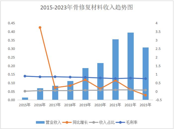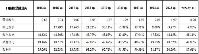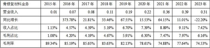 骨修复材料:又称骨粉,在种植牙过程中,通常用于牙颌骨缺损或骨量不足的填充和修复。公司骨修复材料业务起步于2015年。从2015年到2023年,骨修复材料业务收入从0.01亿元增长20.14倍至0.31亿元,CAGR为46%。尽管目前该项业务体量不大,但它的增长速度较快。毛利率也不低。详见下表、图。