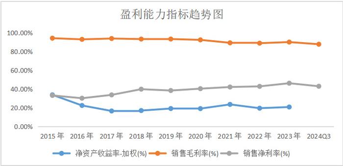 偿债能力:从2015年到2024年三季度末,正海生物的资产负债率在8.45%~19.72%,近三年一期的资产负债率分别为15.46%、12.34%、10.04%和8.45%。近三年一期流动比率在5.26~ 9.93,速动比率在4.91 ~ 9.36,均大于1。