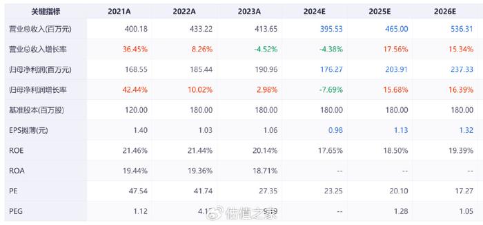 根据机构一致性预测,2024~2026年的营业收入分别为3.95亿元、4.65亿元和5.36亿元,归母净利润分别为1.76亿元、2.04亿元和2.37亿元,PE分别为23.25、20.1、17.27,2025年和2026年的PEG分别为1.28和1.05。