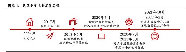2018 年起,公司拓展并致力于扩大功率半导体新产业,打造SmartIDM生态圈。2018 年 6 月,民德电子全资收购整合以电子元器件分销业务为主业的泰博迅睿公司,以功率半导体分销为切入点,正式进驻半导体行业。2020 年 6 月,公司控股收购广微集成技术(深圳)有限公司,进入功率半导体设计行业,迈出发展功率半导体行业的关键一步。2020 年7月,公司参股投资浙江晶睿电子科技有限公司,进一步布局半导体硅片行业。2021年 6 月,公司第二次增资参股晶睿电子,增强对该硅片企业的掌控力。2021年 10 月,公司参股投资浙江广芯微电子有限公司,布局晶圆代工领域。2022年 2 月,公司二次增资广芯微电子,以满足公司功率半导体产业日益增长的晶圆代工产能需求,大幅提升功率半导体新产品开发效率,打通功率半导体全产业链,公司的功率半导体 Smart IDM生态圈已初具雏形。