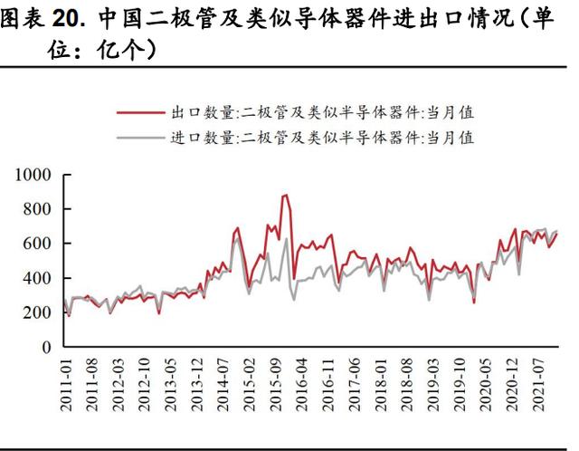 2021 年,我国二极管月度出口数量回升到近700 亿个/月。就国内市场规模(按销量)而言,自 2014 年起,国内二极管月度出口数量逐渐超过进口数量,2015 年底国内二极管月度出口量达到峰值,接近900 亿个/月。近几年由于中美贸易摩擦严重影响了中国电子产品出口。2021 年,我国二极管月度出口数量回升到近 700 亿个/月。