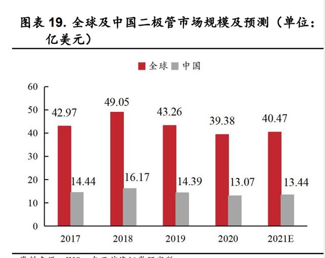 技术壁垒较低,市场规模稳定。与其他功率半导体相比,二极管的技术壁垒较低,制造技术相对成熟,海外大厂有逐步退出该类市场的趋势,中国企业有望凭借低成本及政策优势逐步占据市场,成为功率器件中率先实现国产替代突破的领域。根据 IHS 预测,2021 年全球及中国二极管市场规模将分别达到 40.47 和 13.44 亿美元。