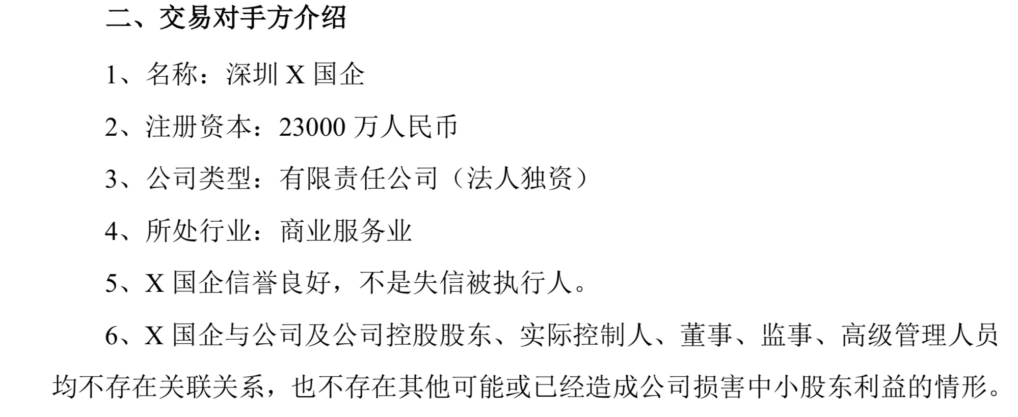 有投资者根据公告显示的交易对手方介绍信息筛选,猜测深圳X国企或为“中广核检测技术有限公司、深圳市飞思通信技术有限公司、深圳市信息基础设施投资发展有限公司、深圳市国信瑞达担保投资有限公司”四家之一。对此,财联社记者已向弘信电子发送邮件求证,但截至发稿尚未收到回复。