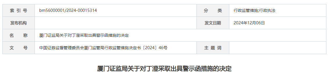 鉴于上述短线交易成交金额、获利金额不大,且收益已全部上缴公司,根据《证券法》第一百七十条第二款的规定,厦门证监局决定对丁澄采取出具警示函的监督管理措施。丁澄和丁澄的亲属应当引以为戒,认真吸取教训,切实加强证券法律法规学习,严格规范交易行为,杜绝此类违法行为再次发生。