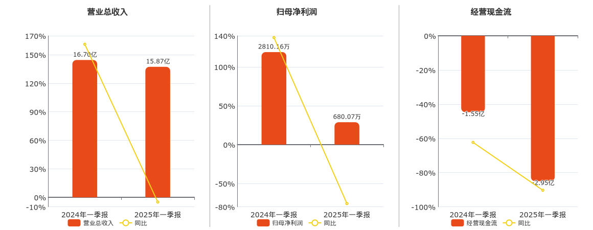 公司营业总收入为15.87亿元,较去年同报告期营业总收入减少8293.21万元,同比较去年同期下降4.97%。归母净利润为680.07万元,较去年同报告期归母净利润减少2130.09万元,同比较去年同期下降75.80%。经营活动现金净流入为-2.95亿元,较去年同报告期经营活动现金净流入减少1.40亿元。