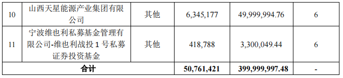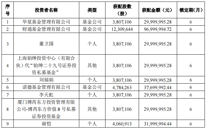 具体来看,华夏基金获配380.71万股,获配金额为3000万元;“定增王”财通基金获配1231万股,获配金额为9700万元,也是11家发行对象中获配金额最多的机构;诺德基金获配478.43万股,获配3770万元。