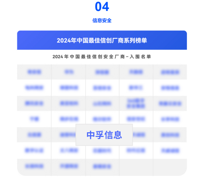 本次最佳信创厂商系列榜单,包括综合榜、细分行业榜、优秀案例榜三大类。第一新声基于大数据优势,并通过调研问卷、电话访谈等多种形式,收集企业数据信息,建立独家评选指标体系;同时邀请甲方企业高管、产业专家、一线投资机构合伙人等专家担任评审,从业务数据、财务数据、产品能力、服务能力、市场影响力等多维度展开评选,最终评选出相应榜单。此次入围名单主要为「细分行业榜」,「2024年中国最佳信创厂商TOP50」及「2024年中国信创厂商优秀案例榜」将在6月的最终榜单中正式发布。中孚信息凭卓越的技术经验,实力入围【2024年最佳信创安全厂商】榜单。