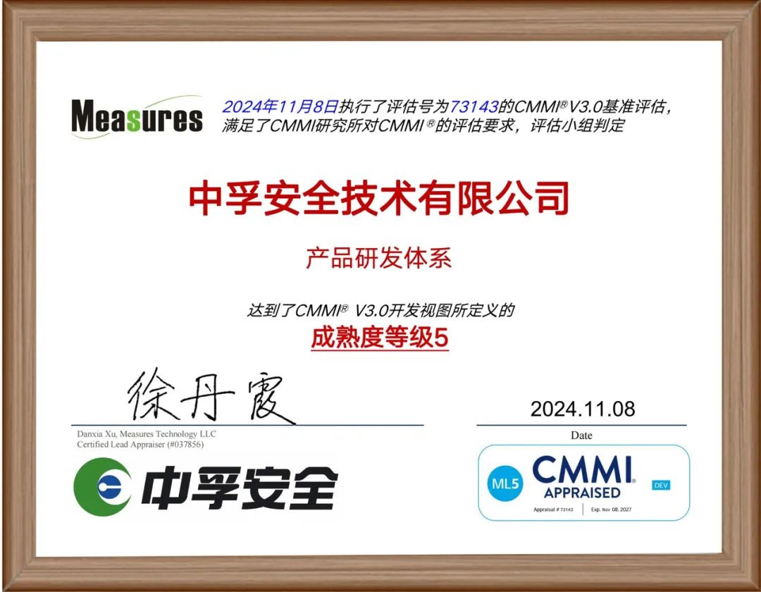 11月,经过国际权威机构综合评估认定,中孚信息全资子公司中孚安全技术有限公司正式通过全球软件领域CMMI5级评估认证,即“软件能力成熟度集成模型”认证。这是国际公认的衡量软件企业研发能力成熟度和项目管理水平的权威标准,代表着国际上最先进的软件工程管理方法。