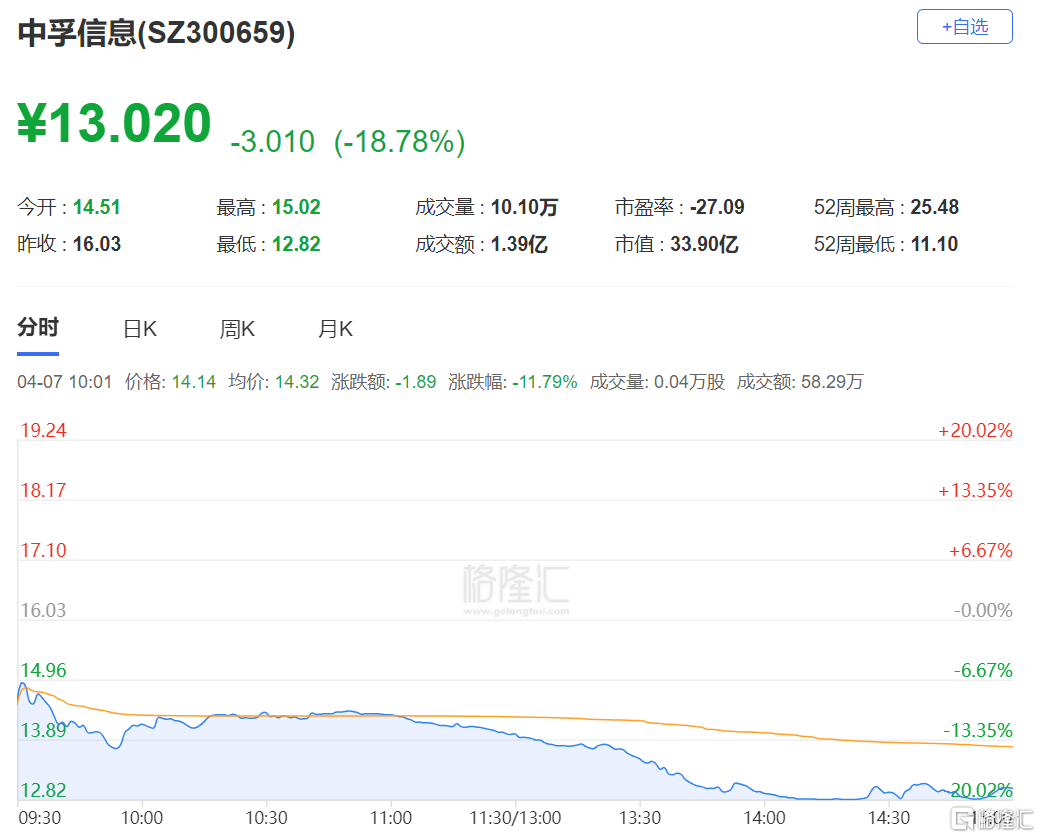 当日,受美国“对等关税”政策引发全球股市震荡影响,中孚信息股价大跌超18%,收盘价为13.02元,总市值骤降至33.9亿元。