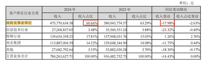 即便2024年亏损收窄至1.25亿元,但核心市场华东、华南区域收入依然下滑33.37%和29.99%,政府及事业单位客户收入下滑17.98%且贡献超60%营收,叠加行业需求延后、招投标放缓,中孚信息的“止血”之路依旧漫长。