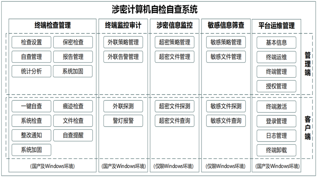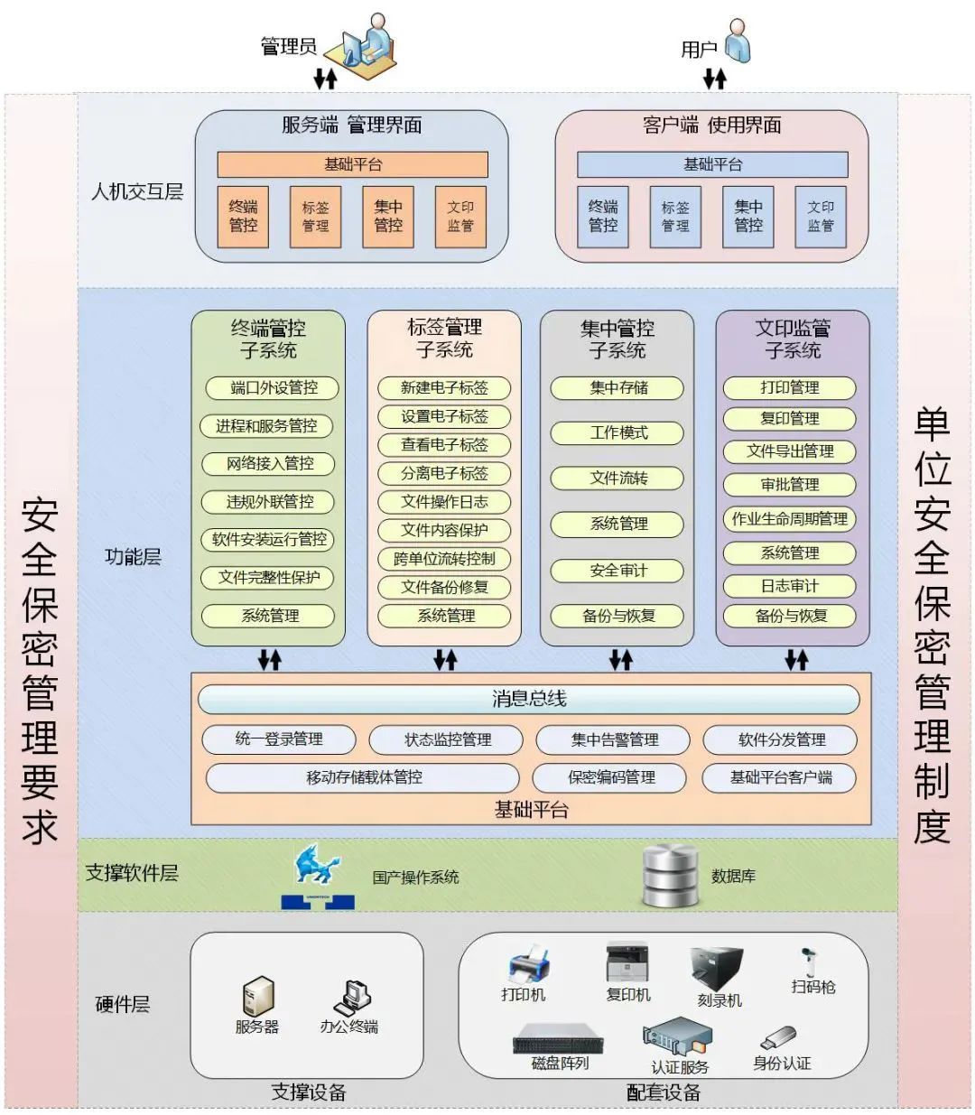系统由一个基础平台及终端管控、标签管理、集中管控与文印监管四个子系统构成,主要实现统一运维管理、终端外设接口管控、文件标签管理、文件加密集中存储以及文印输出全程管控等核心功能,是军队国产自主可控涉密计算机所必需的安全保密专用系统。