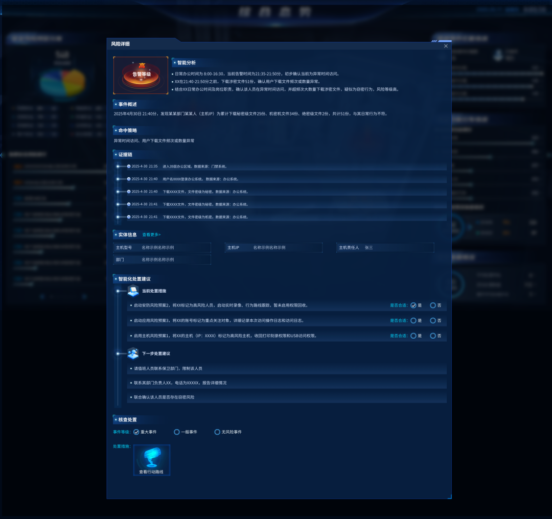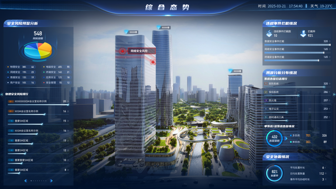 系统以军队安全防护标准为依据,统一接入各类安全设备、终端防护系统、网络设备、等日志与网络流量,依托自研算法模型,对行为日志及网络流量进行深度分析,既能智能识别网络配置违规、越权访问等管理性风险,亦能精确检测异常流量、非法连接等网络安全事件,还能够动态监控高危泄密行为等人员行为风险。系统可实时监控网络运行与人员泄密隐患,通过标准化处置流程实现快速响应,推动安全防护模式从被动防御向主动预警的转型。