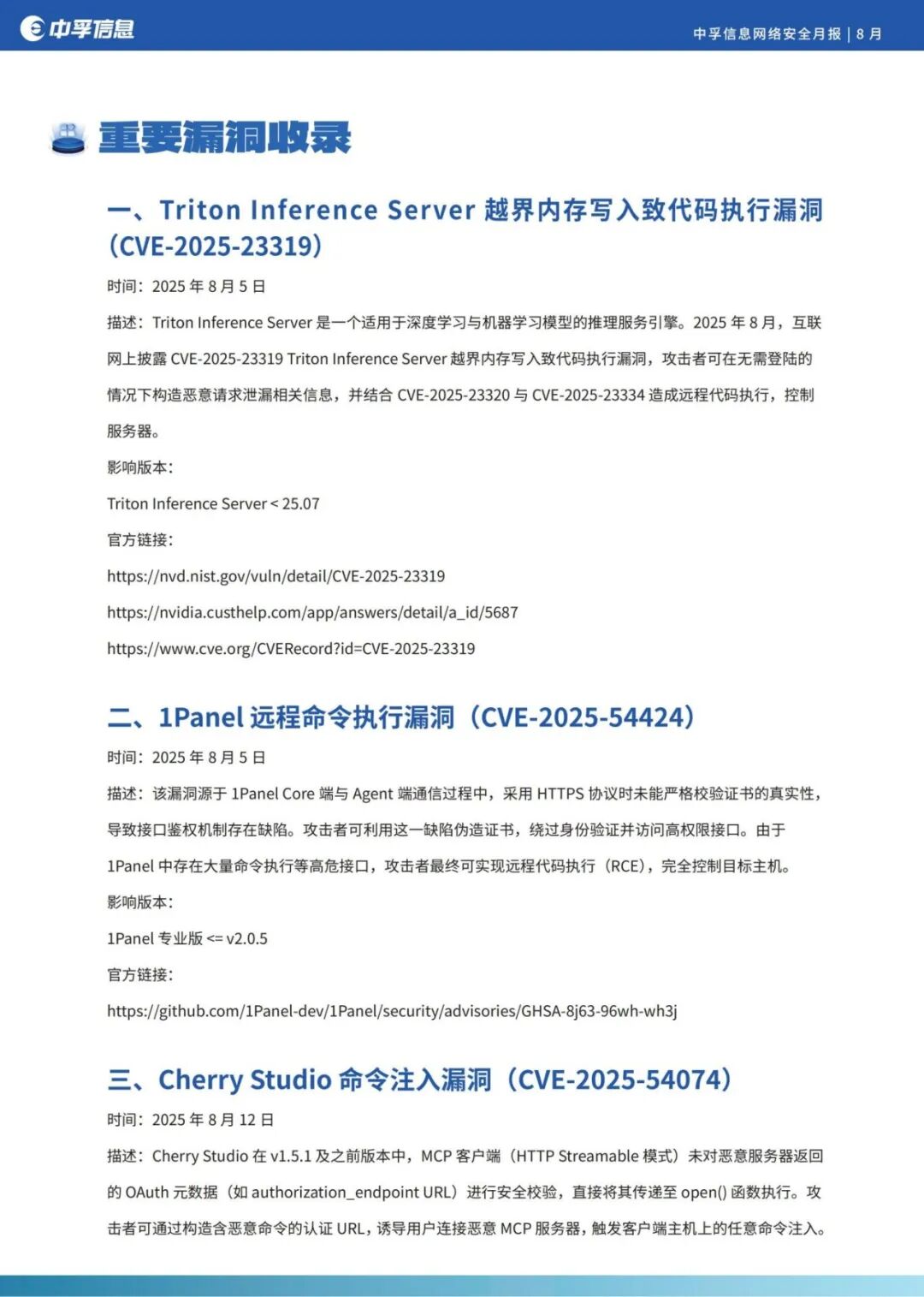 在本月收录的安全漏洞里,影响较大且值得关注的是:Triton Inference Server 越界内存写入致代码执行漏洞(CVE-2025-23319);1Panel 远程命令执行漏洞(CVE-2025-54424);Cherry Studio 命令注入漏洞(CVE-2025-54074)等。