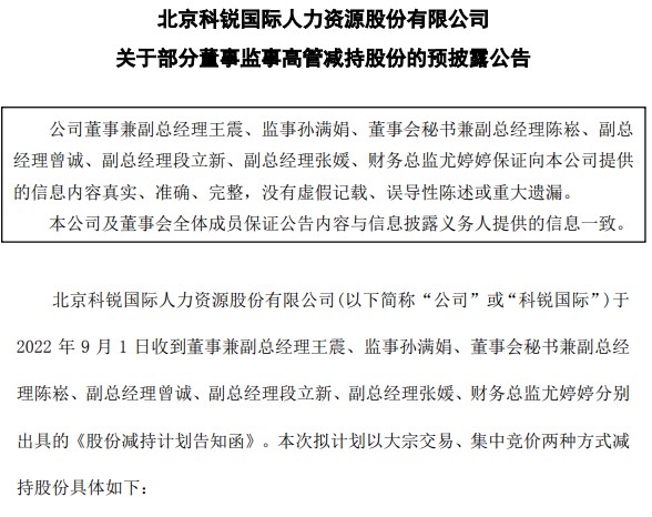 昨日晚间,科锐国际(300662)公告称,公司于2022年9月1日收到董事兼副总经理王震、监事孙满娟、董事会秘书兼副总经理陈崧、副总经理曾诚、副总经理段立新、副总经理张媛、财务总监尤婷婷分别出具的《股份减持计划告知函》。上述董监高拟通过集中竞价及大宗交易方式合计减持公司股份80.9966万股,占公司总股本0.4115%。