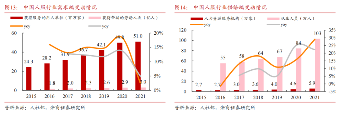 供给端:疫后行情强劲反弹,行业服务规模稳步上升。据人社部数据披露,2015-2021年人服行业市场规模从0.97万亿元提升至2.46万亿元,2015-2021年CAGR为16.8%,受外生冲击影响2020年增速显著放缓,仅同增2.04%;2021年强劲反弹,高增速持续,同增20.89%,恢复弹性较强。此外数据还显示,截至2021年底,全国各类人力资源服务机构5.91万家,从业人员103.15万人,同增29.04%/22.32%,2015-2021年CAGR 分别为13.88%/10.95%;截至2021年底,全国获得服务的用人单位0.51亿家,获得帮助的劳动人次3.04亿人,同增2.33%/4.83%,2015-2021年CAGR 分别为13.13%/9.13%。