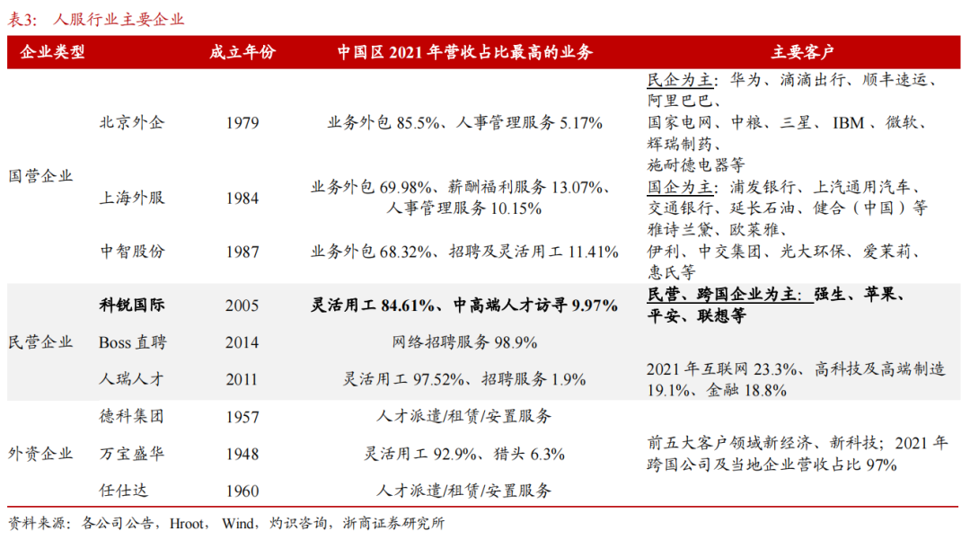我国人服行业主要企业以背景划分主要为国有企业、民营企业和外资企业三类。国有企业背景深厚,起步早叠加强规模优势为行业中坚;民营企业、外资企业专攻细分赛道。