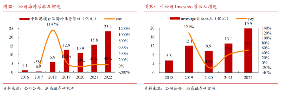 海外分支业务呈现高速增长态势,为公司整体业绩增长提供了强有力支撑。截至2022年底,公司外海区域收入 23.38亿元,占整体业务营收的 25.72%,同比增长 48%。其中,主要为英国及欧洲区域的蓝筹企业以及中小企业提供服务的Investigo,作为公司海外业务开展的重要控股子公司,营收同比增长近 52%。基于其优秀表现,公司在2022年进一步增持10%股权,加码海外业务布局。未来公司将通过资本运作等方式进一步优化海外资源配置与布局,以增强持续盈利能力进而带动公司全球化发展进程。