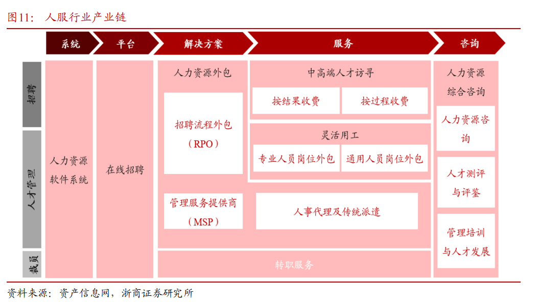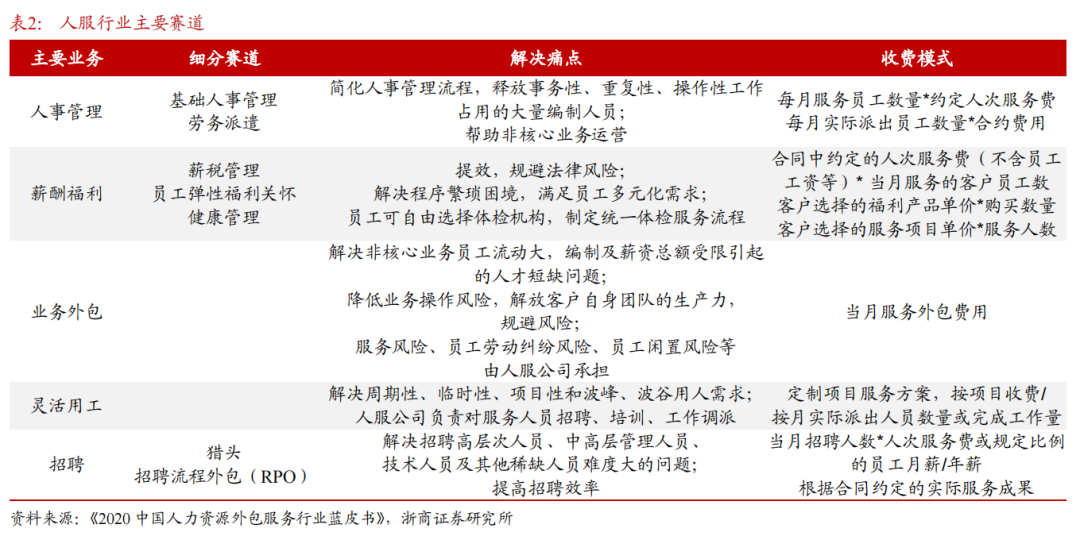 需求端:业务链涵盖人员雇佣全流程,阶段性需求催生行业细分赛道。传统的人力资源服务主要包含招聘流程外包、人事代理、传统派遣、业务外包和薪酬福利等服务。对中高端人才和临时工的需求则分别催生了中高端人才访寻(猎头)和灵活用工产业。