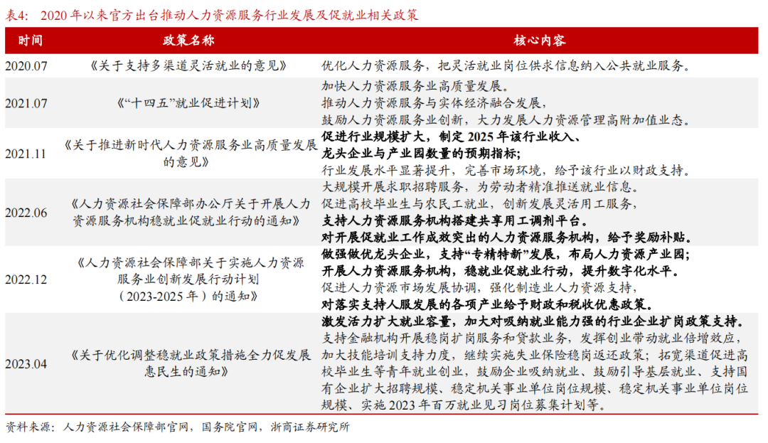 政策支持及补贴激励加速行业发展,违规企业出清利好龙头企业资源集中。近年来,在稳就业导向下国家陆续出台支持政策推动人服行业规模化、高质量发展,同时给予人服企业财政补贴,切实支持企业扩大规模。2022年12月人力资源社会保障部提出,培育壮大人力资源服务市场主体,到2025年重点培育形成50家左右人力资源服务龙头企业和100家左右“专精特新”企业。