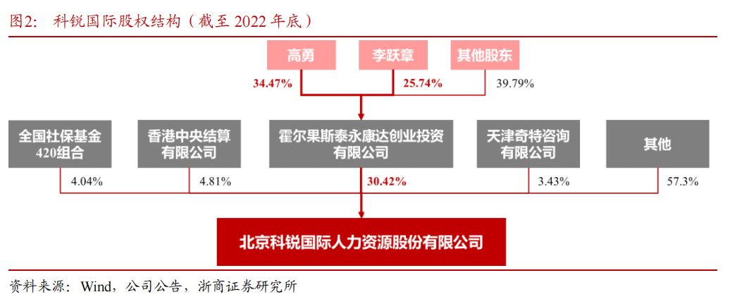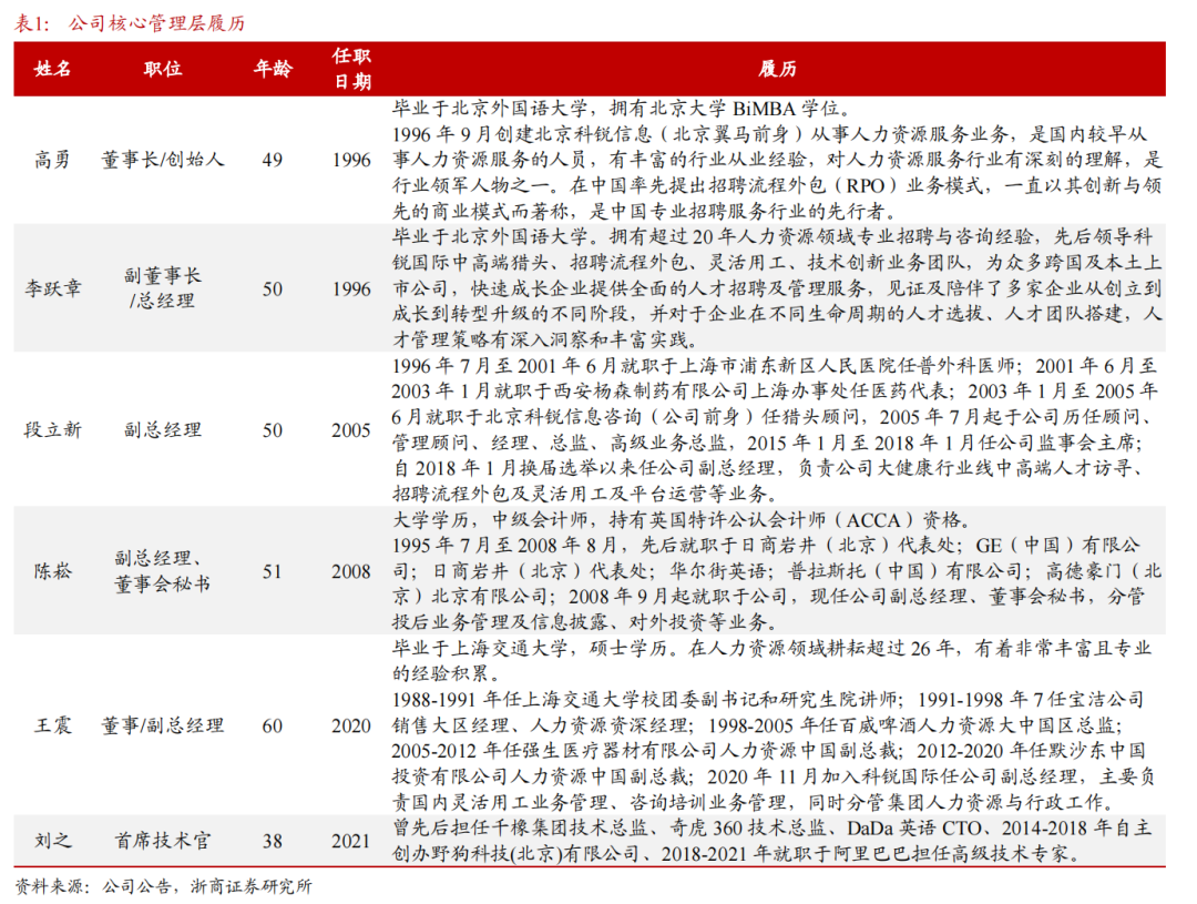 公司创始人即实控人,公司核心管理团队稳定且具备丰富的行业经验。据公司2022年报显示,控股股东泰永康达持有公司股权30.42%,而公司创始人高勇及李跃章合计持有泰永康达60.21%的股份,为公司实控人。创始人高勇作为中国专业招聘服务行业的先行者,自创立公司以来已具备超26年行业经验,并率先将招聘流程外包(RPO)业务模式引入中国。李跃章亦拥有超20年人力资源领域专业招聘与咨询经验,先后领导科锐国际中高端猎头、招聘流程外包、灵活用工及技术创新业务团队。此外,公司核心管理团队平均任职时间超15年,团队稳定且具备丰富的实践经验。