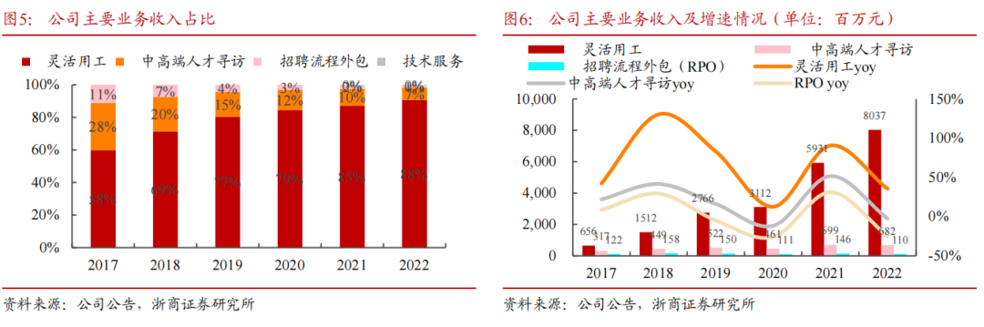 营收利润稳步增长,灵活用工业务为贡献主力。20-22年分别实现营收39.32/70.10/90.92亿元,5年CAGR达51.6%;归母净利润1.86/2.53/2.91亿元,5年CAGR近31.4%。面对近年来多变且极具挑战的市场环境,公司依然保持了稳定且出色的增长,传统线下业务稳步增长,海外中高端业务增速显著,使得公司在特殊宏观背景时期,利润释放依旧保持增长趋势。