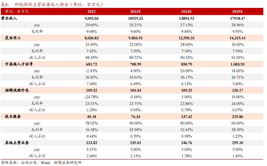 1)灵活用工:为公司核心业务收入贡献,考虑到当前我国灵活用工渗透率依然相对较低,公司技术端布局规模效应亦有望逐步显现,该业务在公司强化流程管理与系统升级提效的双重赋能下有望保持高速增长趋势并逐年提速,预计灵活用工业务23/24/25年增速为+22%/+28%/+30%。