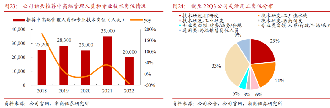 灵活用工业务在公司强化流程管理与系统升级提效的双重赋能下依然保持高速增长趋势。多变的市场环境推动了用工企业对降本增效的关注以及对提高组织敏捷性的重视,为人力资源服务市场释放出更多岗位外包需求。截至2022年底,公司灵活用工业务累计派出近36.9万人次,同比增长18.28%;公司在册灵活用工岗位外包员工超3.27万人,时点人数同比净增 3.28%,分布在通用专业类白领岗位(财务、法务、合规、人事、行政、采购等),技术研发类岗位(IT 研发、工业研发、医药研发、技术服务等)和通用类岗位(终端销售、市场营销等);在以上三大类外包岗位中,技术研发类岗位作为公司岗位外包业务的重点布局的方向,结构上占比增长拉动了灵活用工业务营业收入的整体增长。