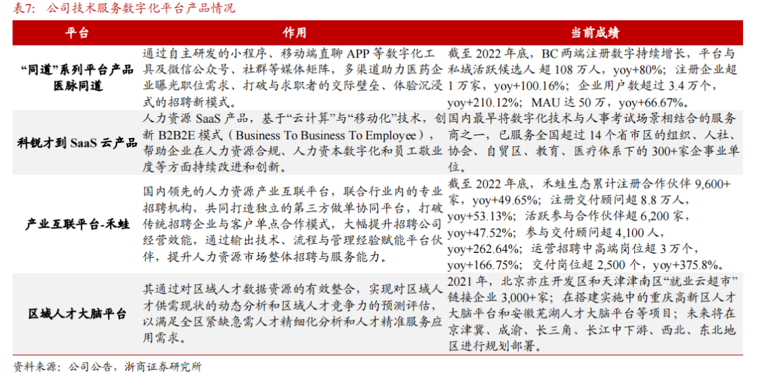 平台开发建设初见成效,广泛链接区域长尾及专精特新类目标伙伴协同合作。公司在“一体两翼”的基本战略指引下,通过加大技术投入,进一步完善“技术+平台+服务”产品生态模式;通过自主研发、投资、并购等方式陆续推出“同道”系列垂直招聘平台、人力资源产业互联平台、人力资源管理 SaaS 平台等多个技术产品;通过构建线上产品与线下服务业务相融合的运营模式,为企业人才配置与业务发展提供人力资源整体解决方案,为区域引才就业与产才融合提供全链条人力资源服务。截至2022年底,公司通过垂直招聘平台、产业互联平台、SaaS技术平台触达各类客户超2.5万家,运营招聘岗位超14.2万,链接生态合作伙伴超9,600家。
