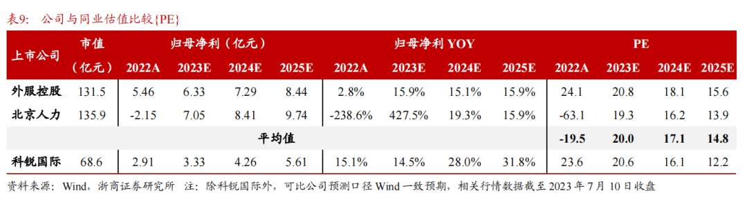 我们认为科锐国际作为人服行业领军公司,在三大业务稳健发展的基础上,积极布局科技提效数字化转型及海外业务的拓展,预计将呈现新的成长动力。我们预计23/24/25年公司归母净利润分别实现3.3/4.3/5.6亿元,yoy+14.5%/28.0%/31.8%,公司当前市值对应23-25年PE分别为20.6X/16.1X/12.2X,整体低于行业平均估值水平。